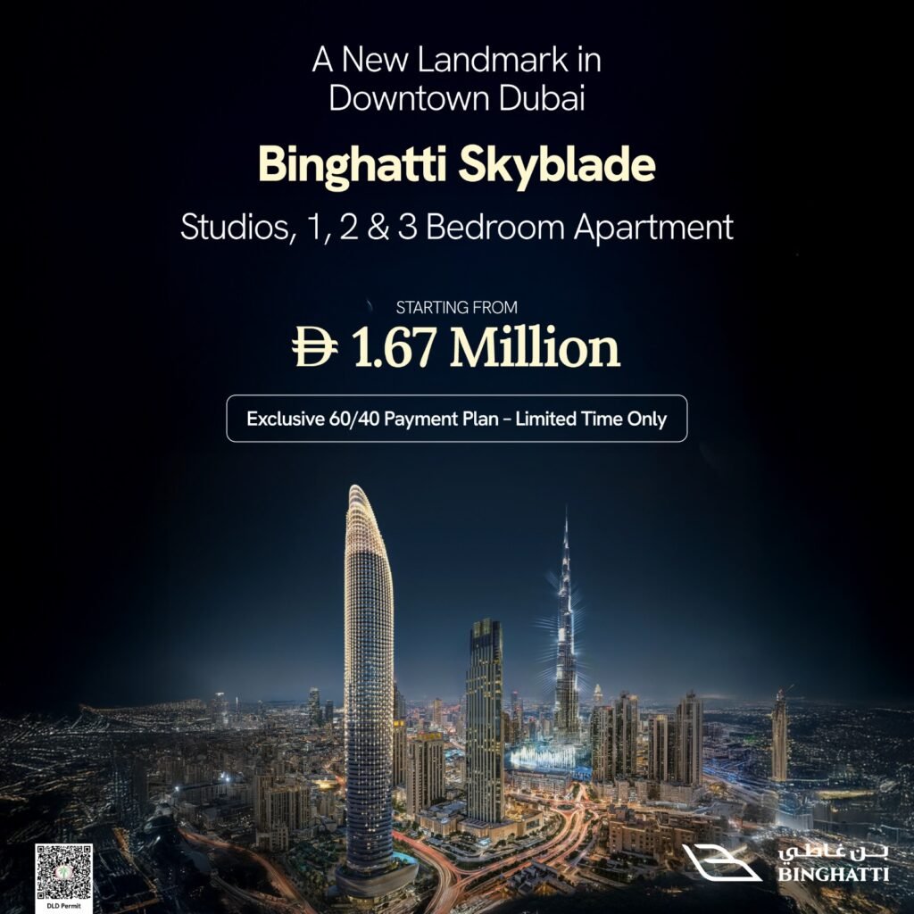 Binghatti Skyblade – Dubai’s fastest developer with a flawless on-time delivery record, bringing you luxury residences with Burj Khalifa views and private pools. Download the brochure now and claim your share in Downtown’s most iconic new tower.